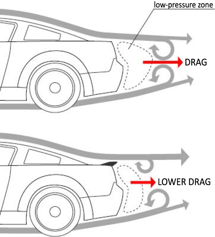 يتشكل السحب أو (Drag Force) في جزء كبير منه بسبب انفصال الهواء خلف السيارة وتكوّن منطقة اضطراب ودوامات في المؤخرة وتسمى منطقة الاستيقاظ الهوائي وكلما كان الانفصال أكبر زادت خسائر الضغط وزادت مقاومة الهواء ولذلك تهتم التصميمات الحديثة بخطوط السقف والمؤخرة وحواف الفصل لأن التحكم في مكان انفصال الهواء يقلل السحب |