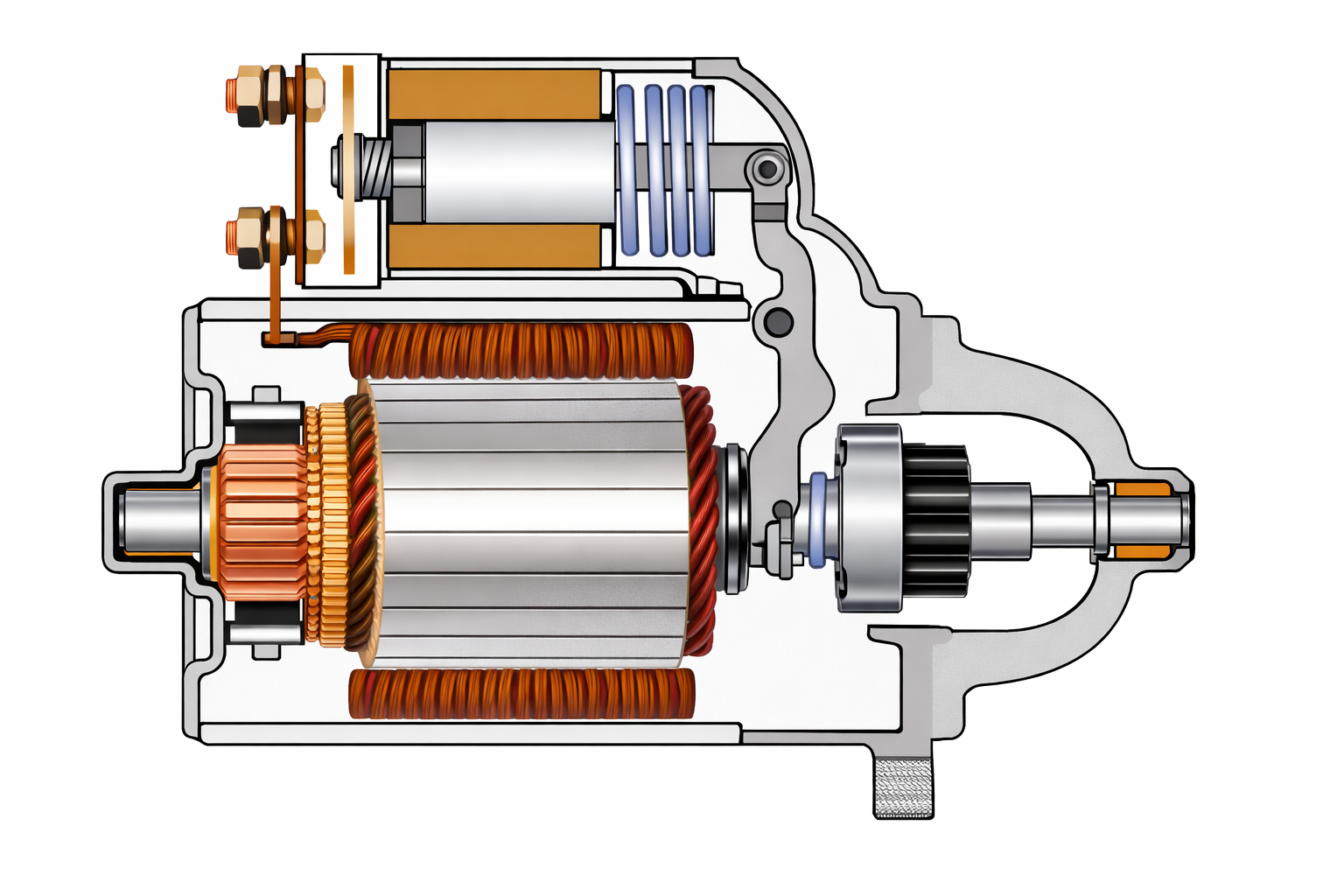 آلية العمل تعتمد على جزئين يعملان معًا في نفس اللحظة: جزء ميكانيكي للتعشيق، وجزء كهربائي لتمرير تيار كبير. عندما تعطي أمر التشغيل، يتحرك السولونويد (المفتاح الكهرومغناطيسي) فيدفع ترس السلف الصغير للأمام ليتعشّق مع ترس الحدافة، وبعد اكتمال التعشيق يقوم السولونويد بإغلاق نقاط توصيل قوية تسمح بمرور تيار عالٍ من البطارية إلى محرك السلف، فيبدأ السلف بالدوران وتدوير الحدافة ثم عمود المرفق. هذا التسلسل مهم لأن الهدف أن لا يبدأ السلف بالدوران تحت حمل قبل أن يتم التعشيق بشكل صحيح. |